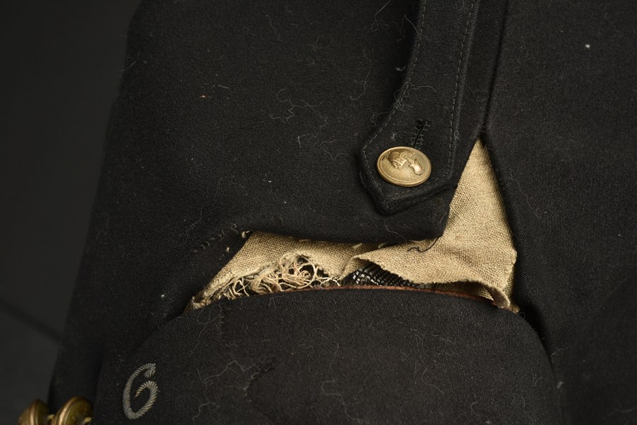 Veste 1896 d'un lieutenant du 9ème génie. Modèle 1896, confectionné en drap noir, pattes de col brodées cannetilles du 9ème régiment de génie fermant sur le devant par 9 boutons portant l'arme du génie. 4 poches de poitrine, deux poches de hanche, insigne brodé cannetille des chemins de fer sur la manche droite. On y joint un brassard du service militaire des chemins de fer. Etat II+. Photos supplémentaires sur www.aiolfi.com. Additional photos on www.aiolfi.com.