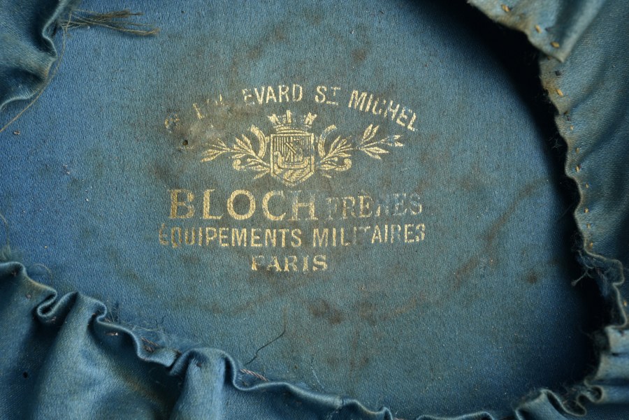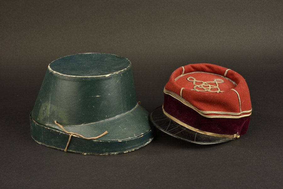 Képi 1872 de lieutenant des services de santé. Modèle 1872, bandeau de velours cramoisi et partie haute en drap garance, jugulaire dorée et boutons du service de santé. Intérieur en soie portant le nom du tailleurs Bloch frères. Bandeau en cuir rehaussé d'une dorure, visière en cuir verni doublé d'un maroquin. On y joint sa boite de transport d'origine en carton vert en très bon état. Etat II+. Photos supplémentaires sur www.aiolfi.com. Additional photos on www.aiolfi.com.