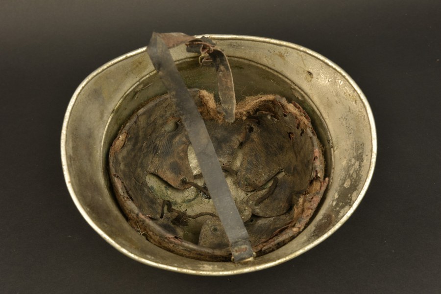 Casque de pompier 1885 d'officier. En acier nickelé, cimier portant une grenade argentée rapportée. Plaque en laiton à la grenade avec le bandeau Sapeurs Pompiers Cire d'Aunis. Coiffe intérieure et jugulaire abimées. Etat II+. Photos supplémentaires sur www.aiolfi.com. Additional photos on www.aiolfi.com.