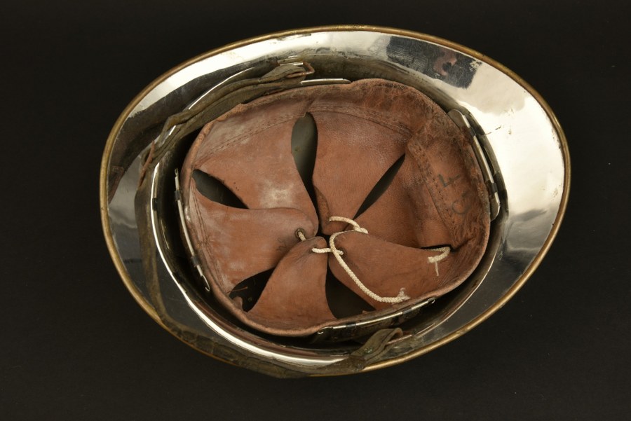 Casque de pompier de Vendée 1933 officier. En acier nickelé, modèle 1933, cimier portant une grenade rapportée. Plaque officier argentée portant le bandeau Sapeurs Pompiers de la Vendée. Coiffe intérieure spécifique au modèle 1933 complet avec sa jugulaire en cuir. Etat II+. Photos supplémentaires sur www.aiolfi.com. Additional photos on www.aiolfi.com.