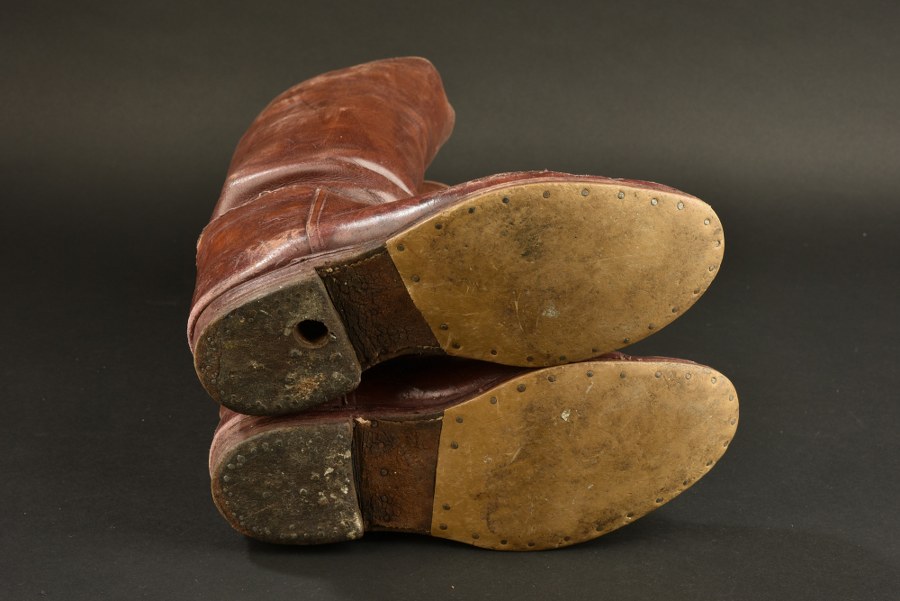 Paire de bottes type Spahis. En cuir marron à teinte rougeâtre, ressemelées, talon percé pour mannequin. Hauteur 43cm. Longueur 29cm. Etat II+. Photos supplémentaires sur www.aiolfi.com. Additional photos on www.aiolfi.com.