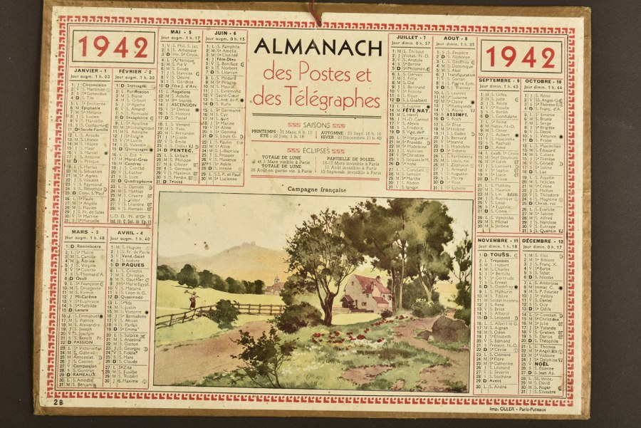 Ensemble de souvenirs Vichy. Comprenant une assiette à l'effigie du Maréchal Pétain fabriquée par GDF à Limoges, visa de censure OA254. Un portrait en couleurs du Maréchal (33x24cm). Discours numéro 1 par Philipe Henriot. Une vignette Milice Française. Deux livrets et une carte postale du Maréchal. Livret message du Maréchal. Un journal de Nancy daté du 22 juin 1944. Un almanach daté 1942. Etat II+. Photos supplémentaires sur www.aiolfi.com. Additional photos on www.aiolfi.com.