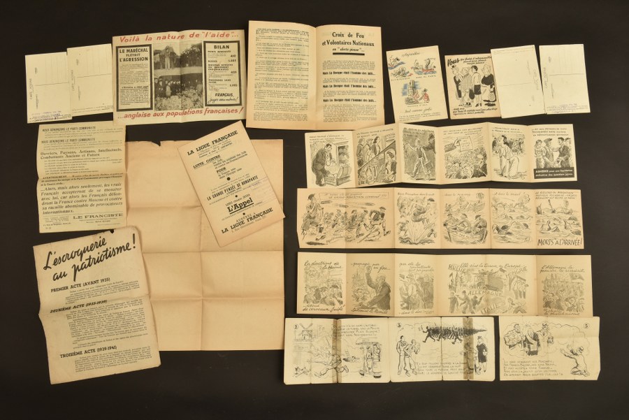 Ensemble de documents et tracts période Occupation. Ensemble comprenant 12 tracts et une affiche. L'escroquerie du Patriotisme, Les Paroles et les actes, 25 ans de Bolchevisme, Nous ne mourrons pas pour Staline, 2 tracts contre La Rocque tamponnés par la Ligue Française, l'Olympiade 1941, tract contre le marché Noir, tract anti communiste, Ragots Bobards et racontars, Paroles dorées de Mr Churchill adressées à la nation Française, Le Chancre à rongé la France. 4 cartes postales dont une tamponnée Le francisme centre de Diffusion. Une affiche La triste Histoire de Winston Churchill format 40x31 cm. Etat II+. Photos supplémentaires sur www.aiolfi.com. Additional photos on www.aiolfi.com.