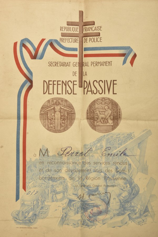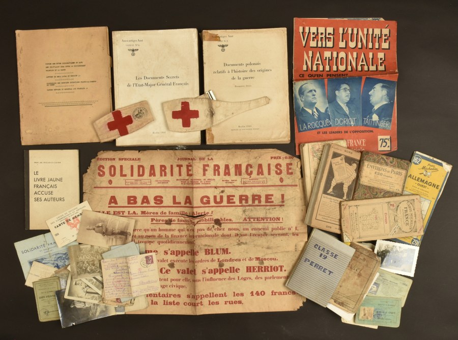 Ensemble de documents relatifs à l'Occupation. Comprenant les documents secrets de l'état major numéro 3 et 6, une copie des notes diplomatiques entre la France et le Reich, journal solidarité française en mauvais état, journal vers l'unité national, le livre jaune français. Un lot de cartes, un livret militaire, documents défense passive, cartes Michelin, des lettres ainsi que deux brassards croix rouge. Etat II+. Photos supplémentaires sur www.aiolfi.com. Additional photos on www.aiolfi.com.
