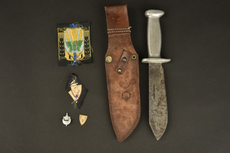 Poignard chantier de jeunesse. Marquage illisible hormis Déposé, lame oxydée. Fourreau en cuir marron, coutures refaites, initiales à l'arrière du passant et tampon de réception illisible. On y joint l'insigne général du second type des chantiers de jeunesse, un insigne de béret des LFC, un insigne de boutonnière de la LFC, un insigne à la francisque (attache cassée). Etat II+. Photos supplémentaires sur www.aiolfi.com. Additional photos on www.aiolfi.com.