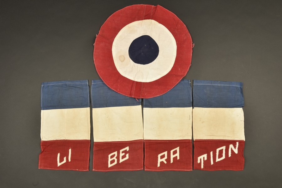 Ensemble de drapeaux Libération. Comprenant quatre petits drapeaux tricolores de 20x38cm, mis côte à côte ils forment le mot LIBERATION. Une cocarde tricolore d'un diamètre de 44cm. Etat II+. Photos supplémentaires sur www.aiolfi.com. Additional photos on www.aiolfi.com.