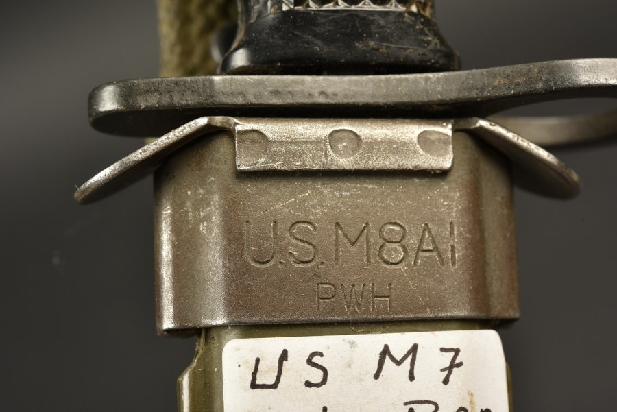 Baïonnette US M7. Poignée en bakélite maintenue par deux vis. Pommeau marqué 7. Garde marquée US M7 MILPAR. Lame dans sa couleur d'origine à 70%. Fourreau USM8A1, fabrication PWH. Peinture kaki à 90%. Crochet de fixation au ceinturon présent. Bouton pression fonctionnel. Cordon en cuir complet. A noter une légère usure et patine de la pièce. Etiquettes collées sur le fourreau. Etat I-. Plus de photos sur AIOLFI.COM, more photos on AIOLFI.COM.