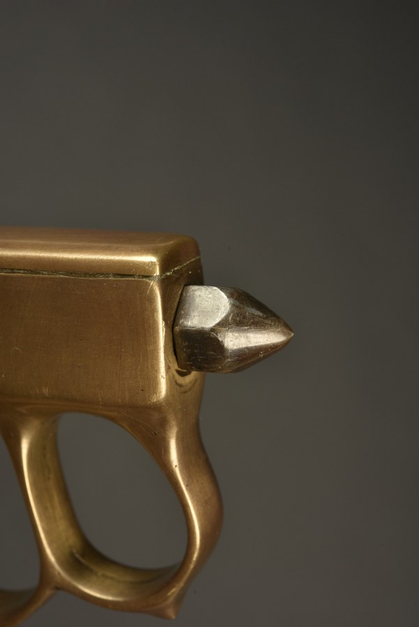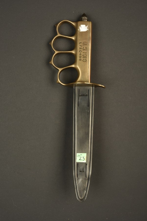 Trench Knife. Poigne en laiton, marquages US 1918 LF & C 1918. Lame dans sa couleur d'origine à 80%. Fourreau en métal. Marquages LF & C 1918. Bosses sur le fourreau. Authenticité de la pièce non garantie. Un crochet manquant. A noter une légère usure et patine de la pièce. Etiquettes collées sur le fourreau. Etat I-. Plus de photos sur AIOLFI.COM, more photos on AIOLFI.COM.