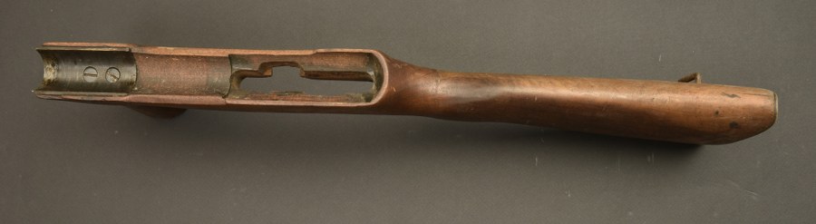 Bois de pistolet mitrailleur ERMA EMP-35. En bois, plaque de couche présente. Poignée en bois probablement postérieur. Anneau de fixation de la sangle présent. Sans marquages visibles. Crosse fendue sur le côté droit et réparée. A noter une certaine usure et oxydation de la pièce. Etat II+. Plus de photos sur AIOLFI.COM, more photos on AIOLFI.COM.