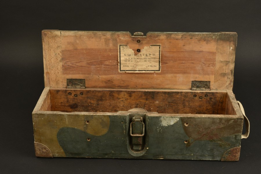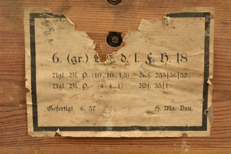Caisse FH 18 camouflée. En bois, et renforts en métal. La poignée de transport en forte toile écrue est présente. Crochet de fermeture complet. Peinture camouflée trois tons d'usine à 70%. Marquages sur le couvercle 6.(gr) Lagd IFH 18. Quatre trous percés sur la face avant de la caisse. Etiquette interne, incomplète. Dimensions 51 x 16 x 14 cm. Toutes les pièces métalliques sont oxydées. Trace d'un X peint sur la face avant. Quelques tâches de peinture. A noter une certaine usure et oxydation des pièces. Collection Thierry Juif Rosebud. Etat II+. Plus de photos sur AIOLFI.COM, more photos on AIOLFI.COM.