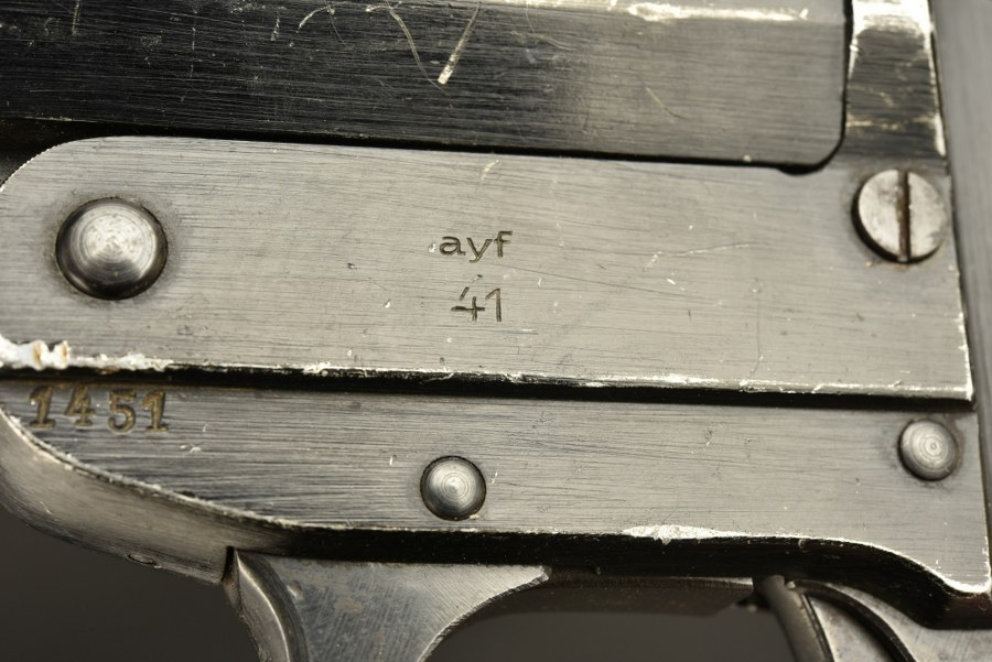 Pistolet lance fusée allemand. En duralium, modèle Z. Peinture noire à 80%. Numéro 1451. Crosse en bakélite, anneau grenadière présent. Lettre Z gravée sur le canon. Fabrication AYF 41. Toutes les pièces mobiles sont fonctionnelles. A noter une légère usure et patine de la pièce. Etat I-. Plus de photos sur AIOLFI.COM, more photos on AIOLFI.COM.
