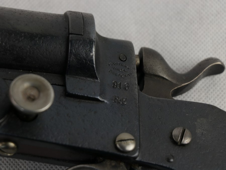 Lance fusée de détresse pistolet Italie CASTEL NIDA. BRESCIA 916 R. E Mod. 1900. WW I. cal. 4. numéro 5609. Surface piquée, pièces métalliques révisées. Fonctionnel. Canon mate. Plus de photos sur AIOLFI.COM, more photos on AIOLFI.COM.