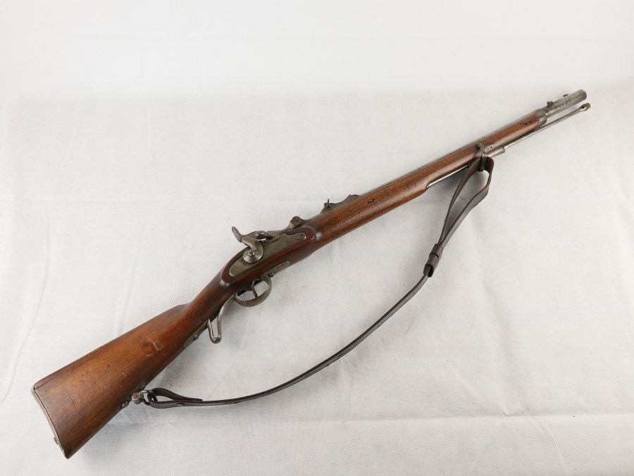 Mousqueton de chasseur M 1867, système Wänzel. calibre 14.2x33 R Wänzl, canon octogonal rugueux rayé. Longueur 65cm. Grand viseur d'arc à l'échelle 4 - 12. Plaque de verrouillage marquée ,854,, bascule ,F. Jester,, racine de canon ,Dpla IN 69,. Cachet de troupe ,III L.V.D 1604,. Toutes les pièces en fer avec patine. Stock de noyer foncé avec des signes d'âge et d'usure, des dommages autour de la zone du museau. Les deux sangles pivotent. baguette. Longueur 110cm. Jägerstutzen M 1867, System Wänzel Kal. 14,2x33 R Wänzl, Gezogener, rauer Oktagonlauf. Länge 65 cm. Großes Bogenvisier skaliert 4 - 12. Schlossplatte gemarkt ,854,, Verschlussgehäuse ,F. Jester,, Laufwurzel ,Dpla IN 69,. Truppenstempel ,III L. V. D 1604,. Alle Eisenteile mit Patina. Dunkler Nussbaumschaft mit Alters- und Gebrauchsspuren, Beschädigungen um Mündungsbereich. Beide Riemenbügel. Ladestock. Länge 110 cm. Plus de photos sur AIOLFI.COM, more photos on AIOLFI.COM. Lors de l'achat, il faudra présenter une copie de la CNI, ainsi qu'un justificatif de domicile de moins de 3 mois.