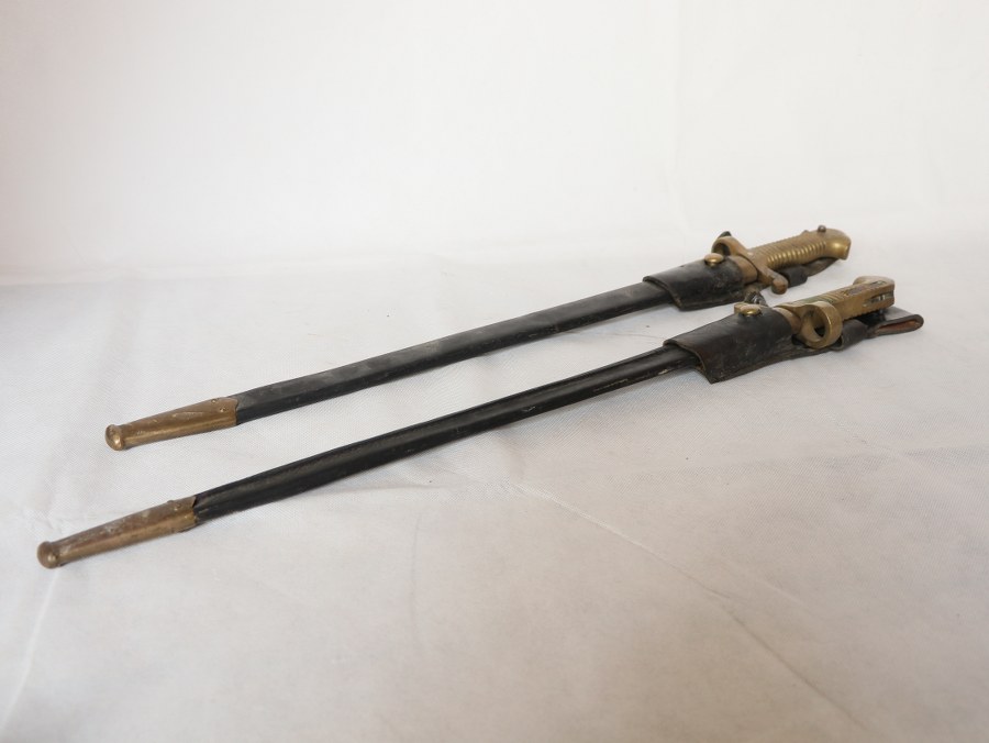 Deux baïonnettes pour le fusil à percussion 1863 Remington Zouave. répliques italiennes. Marqué Made in Italy et India. Chacun complètement dans une gaine en cuir avec des raccords en laiton et une chaussure de couplage. Utilisé.Zwei Bajonette zum Perkussionsgewehr 1863 Remington Zouave. Replicas Jeweils komplett in Lederscheide mit Messingbeschlägen und Koppelschuh.. Plus de photos sur AIOLFI.COM, more photos on AIOLFI.COM