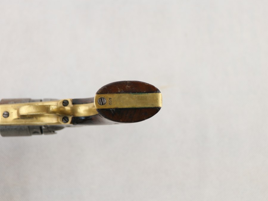 Colt New Model Pocket Pistol in Navy Caliber 38RF conversion. Calibre , 38RF, numéro de série , 659. Cinq coups, numéros correspondants, y compris la plaque de poignée. Production , 1861. Canon de 4 ½ pouces avec un alésage rugueux et mat. Nom de l'entreprise "New York" sur une seule ligne. Pièces métalliques vierges et principalement piquées. Données du brevet sur deux lignes à gauche du cadre. Désignation du calibre sur le pontet , ".36 CAL". bandes de préhension en laiton. Poignée en noyer avec des signes d'âge et d'usure. Ressort principal manquant.Kaliber, 38RF, Seriennummer, 659. Fünfschüssig, nummerngleich incl. Griffschale. Fertigung, 1861. 4 ½ inch Lauf mit rauer, matter Seele. Einzeilige „New York“ Firmierung. Metallteile blank und größtenteils narbig. Links am Rahmen zweizeilige Patentdaten. Am Abzugsbügel Kaliberbezeichnung, „.36 CAL“. Messinggriffbänder. Nussholzgriff mit Alters- und Gebrauchsspuren. Hauptfeder fehlt. Plus de photos sur AIOLFI.COM, more photos on AIOLFI.COM.