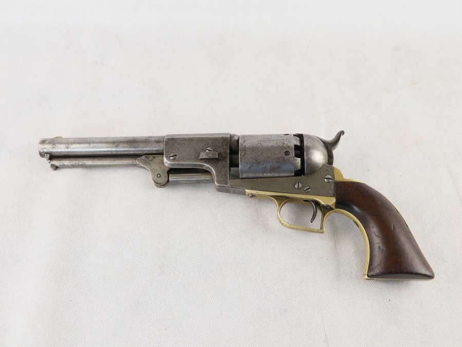 US-Colt First Model Dragoon Percussion Revolver. Calibre , .44 Blackpowder, numéro de série , 4582. Date de production , 1849. Numéros concordants, six coups. Cale de course sans numéro. Canon de 7 ½ pouces avec un alésage légèrement rugueux et mat. Nom de l'entreprise en une ligne , ""{ADDRESS SAML COLT NEW-YORK CITY}". Pièces métalliques presque vierges, légèrement tachées avec de petits restes du bleuissement d'origine. À gauche sur le cadre , ""COLTS/PATENT/U.S.". Divers sous -les marques d'inspecteur "K" et "B" sont encore clairement visibles. Tambour avec gravure de rouleau préservée "Indian Fight Scene" et inscription de brevet et de dragon. Poignée en noyer huilé avec des signes plus forts d'âge et d'usure. Cartouche d'inspecteur à gauche. Mécaniquement ok .Longueur environ 36,5 cm. Kaliber, .44Blackpowder, Seriennummer, 4582. Fertigung, 1849. Nummerngleich, sechsschüssig. Laufkeil ohne Nummer. 7 ½ Inch Lauf mit leicht rauer, matter Seele. Einzeilige Firmierung, „"{ADDRESS SAML COLT NEW-YORK CITY}“. Metallteile nahezu blank, leicht fleckig mit geringen Resten der Originalbrünierung. Links am Rahmen, „"COLTS/PATENT/U.S.". Diverse Sub-Inspectorenmarken „K“ und „B“ sind noch gut zu erkennen. Trommel mit erhaltender Rollgravur „Indianerkampf-Szene“ und Patent- und Dragoon-Beschschriftung. Griff aus geöltem Nussholz mit stärkeren Alters- und Gebrauchsspuren. Inspektorenkartusche links. Mechanisch in Ordnung. Länge circa 36,5 cm. Plus de photos sur AIOLFI.COM, more photos on AIOLFI.COM.