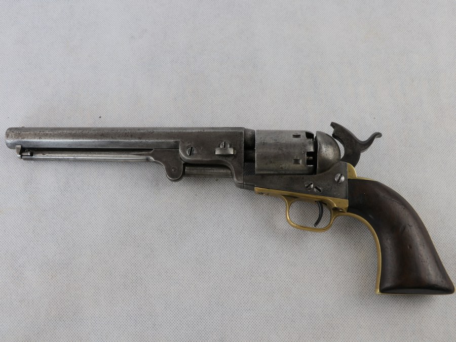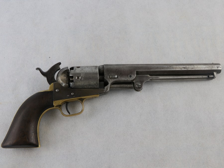 Colt Model 1851 Navy Percussion Revolver. Calibre , .36 Blackpowder, numéro de série , 4606. Six coups, numéros concordants. Cale de course avec ancienne réparation. Fabrication , 1851. Canon de 7 ½ pouces avec un alésage rugueux et un bon profil de champ/rayures. Pièces métalliques vierges et patinées. Au début du canon, le nom de l'entreprise sur une ligne , "-ADDRESS SAML. COLT LA VILLE DE NEW YORK -„. Tambour avec scène de bataille navale clairement reconnaissable, partiellement à grain fin. "Colts/Patent" sur deux lignes à gauche du cadre. Le placage d'argent sur les bandes de préhension en laiton n'est plus disponible. Poignée en noyer avec des signes d'âge et d'usure, pas de numéro de série. Vis d'axe de la presse de chargement renouvelée. Mécaniquement bien. Kaliber, .36 Blackpowder, Seriennummer, 4606. Sechsschüssig, nummerngleich. Laufkeil mit alter Reparatur. Fertigung, 1851. 7 ½ inch Lauf mit rauer Seele und gutem Feld/Zug Profil. Metallteile blank und patiniert. Auf dem Lauf frühe, einzeilige Firmierung, „-ADDRESS SAML. COLT NEW-YORK CITY-„. Trommel mit gut erkennbarer Seeschlachtszene, teilweise feinnarbig. Links am Rahmen zweizeilig „Colts/Patent“. Versilberung an den Messinggriffbändern nicht mehr vorhanden. Nussholzgriff mit Alters- und Gebrauchsspuren, ohne Seriennummer. Achsenschraube der Ladepresse erneuert. Mechanisch in Ordnung. Plus de photos sur AIOLFI.COM, more photos on AIOLFI.COM.