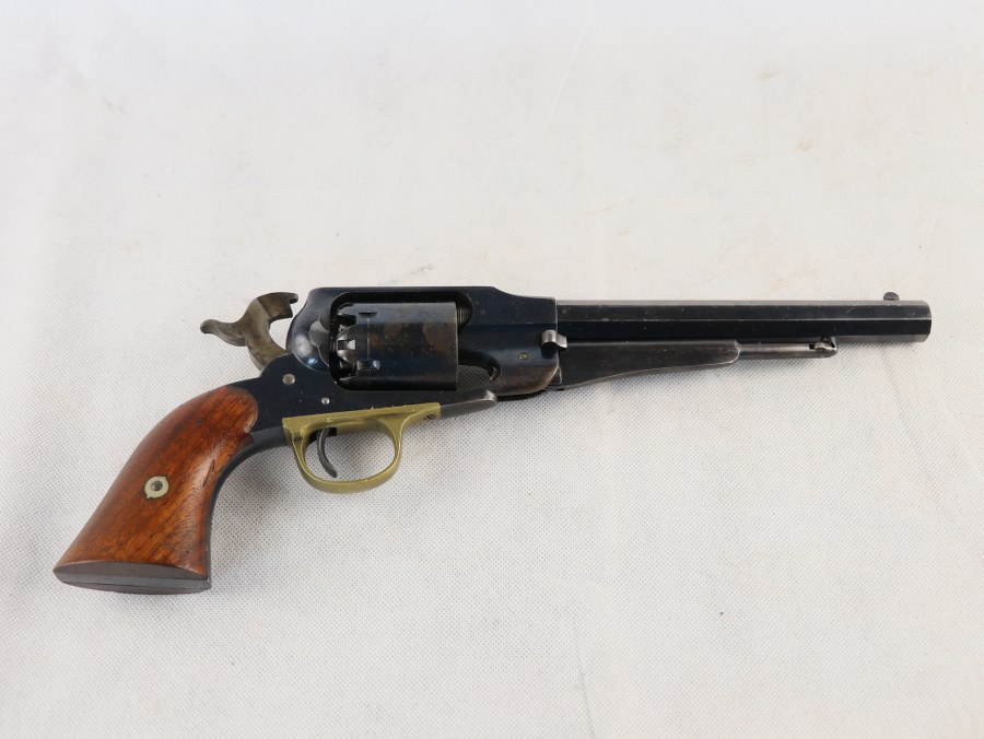 Civil War U.S. Remington New Model Army. Calibre , .44 Poudre noire. Numéro de série , 89521. Six coups, numéros concordants. Canon de 8 pouces à noyau nu. Finition d'origine à 95% préservée, petites taches. Raison sociale sur le canon , "PATENTED. SEPT. 14. 1858/E. REMINGTON & SONS. ILION, NEWYORK. U.S.A./NEW-MODEL". Acceptations diverses. Sur le côté droit du cadre, numéro d'inventaire inamovible du collectionneur. Panneaux de poignée en noyer lisse numérotés correspondants avec de légers signes d'âge et d'usure. Cartouche gauche "GP" pour Giles Porter. SA uniquement. Mécaniquement bien. longueur env. 36 cm. Kaliber, .44Blackpowder. Seriennummer, 89521. Sechsschüssig, nummerngleich. 8 inch Lauf mit blanker Seele. Originale Brünierung zu 95% erhalten, kleine Flecken. Auf dem Lauf Firmierung, "PATENTED. SEPT. 14. 1858/E. REMINGTON & SONS. ILION, NEWYORK. U.S.A./NEW-MODEL". Diverse Abnahmen. Rechts am Rahmen nicht entfernbare Sammler-Inventarnummer. Nummerngleiche, glatte Nussholzgriffschalen mit leichten Alters- und Gebrauchsspuren. Links Kartusche „GP“ für Giles Porter. SA-Only. Mechanisch in Ordnung. Länge circa. 36 cm. Plus de photos sur AIOLFI.COM, more photos on AIOLFI.COM.