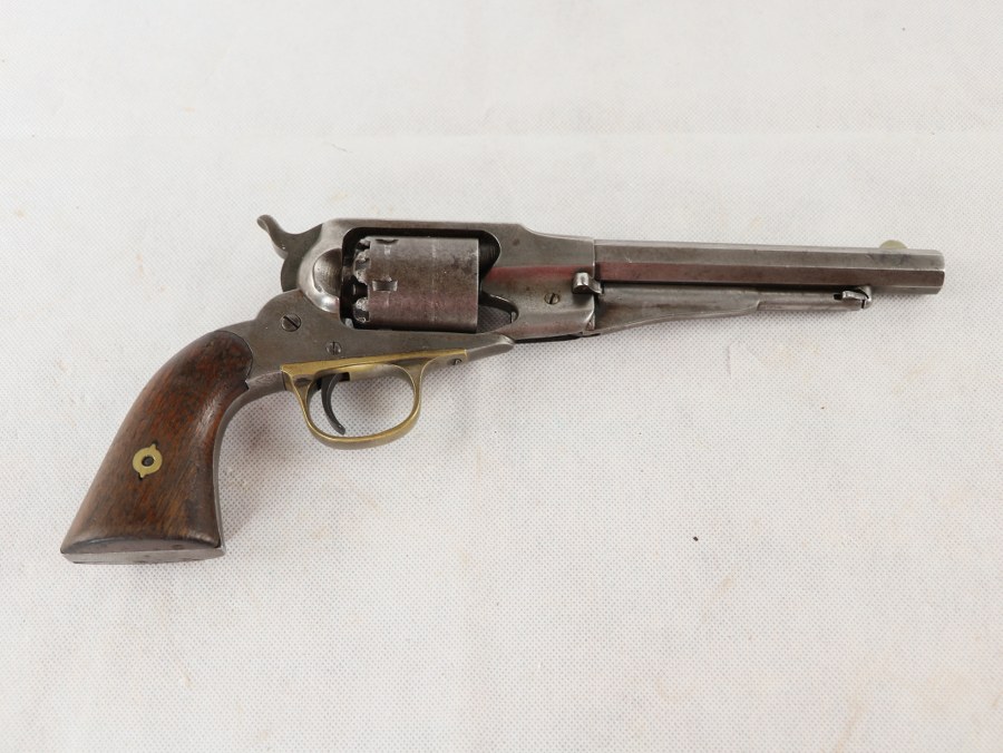 Remington Single Action Belt Revolver. Calibre , .36 Poudre noire. Numéro de série , 3481. Six coups, numéros concordants. Canon de 6,5 pouces avec une âme mate et rugueuse. Parties métalliques presque nues, partiellement tachées. Raison sociale sur le canon , "PATENTED. SEPT. 14. 1858/E. REMINGTON & SONS. ILION, NEWYORK. U.S.A./NEW-MODEL". Panneaux de préhension en noyer lisse avec des signes d'âge et d'usure. SA uniquement. Mécaniquement bien. Longueur environ 30 cm. Rarement. Kaliber, .36Blackpowder. Seriennummer, 3481. Sechsschüssig, nummerngleich. 6,5 inch Lauf mit matter, rauer Seele. Metallteile nahezu blank, teilweise fleckig. Auf dem Lauf Firmierung, "PATENTED. SEPT. 14. 1858/E. REMINGTON & SONS. ILION, NEWYORK. U.S.A./NEW-MODEL". Glatte Nussholzgriffschalen mit Alters- und Gebrauchsspuren. SA-only. Mechanisch in Ordnung. Länge circa 30 cm. Selten. Plus de photos sur AIOLFI.COM, more photos on AIOLFI.COM.