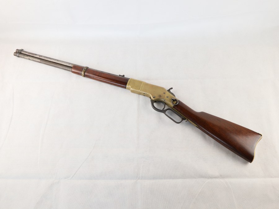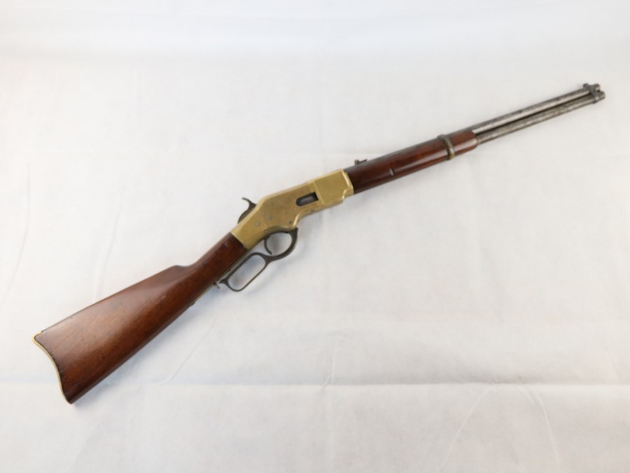 Winchester 1866 Saddle Ring Carbine 3.Model. Calibre .44 RF/CF (conversion) Numéro de série , 149395. Fabriqué en 1878. Canon rond de 20 pouces avec un alésage mat et rugueux. Surfaces métalliques avec restes de bleuissement, tachées. Nom de société standard à deux lignes "WINCHESTER'S - REPEATING ARMS. NEW HAVEN. CT/KING'S IMPROVEMENT - BREVETÉ - 29 MARS 1866. 16 OCTOBRE 1860." Récepteur avec une fine patine. Stock de noyer avec des signes d'âge et d'usure. Il manque les vis des courses, il manque la vis du piston (filetage recoupé). Mécaniquement bien. Longueur environ 99 cm. Kaliber .44 RF/CF (conversion) Seriennummer, 149395. Fertigung 1878. Runder 20 Inch Lauf mit matter, rauer Seele. Metalloberflächen mit Resten der Brünierung, fleckig. Zweizeilige Standardfirmierung "WINCHESTER'S - REPEATING ARMS. NEW HAVEN. CT/KING'S IMPROVEMENT - PATENTED - MARCH 29. 1866. OCTOBER 16 1860." Systemkasten mit feiner Patina. Nussholzschaft mir Alters- und Gebrauchsspuren. Schrauben der Laufringe fehlen, Schraube für Kolben fehlt (Gewinde nachgeschnitten). Mechanisch in Ordnung. Länge circa 99 cm. Kaliber .44 RF/CF (conversion) Seriennummer, 149395. Fertigung 1878. Runder 20 Inch Lauf mit matter, rauer Seele. Metalloberflächen mit Resten der Brünierung, fleckig. Zweizeilige Standardfirmierung "WINCHESTER'S - REPEATING ARMS. NEW HAVEN. CT/KING'S IMPROVEMENT - PATENTED - MARCH 29. 1866. OCTOBER 16 1860." Systemkasten mit feiner Patina. Nussholzschaft mir Alters- und Gebrauchsspuren. Schrauben der Laufringe fehlen, Schraube für Kolben fehlt (Gewinde nachgeschnitten). Mechanisch in Ordnung. Länge circa 99 cm. Plus de photos sur AIOLFI.COM, more photos on AIOLFI.COM.
