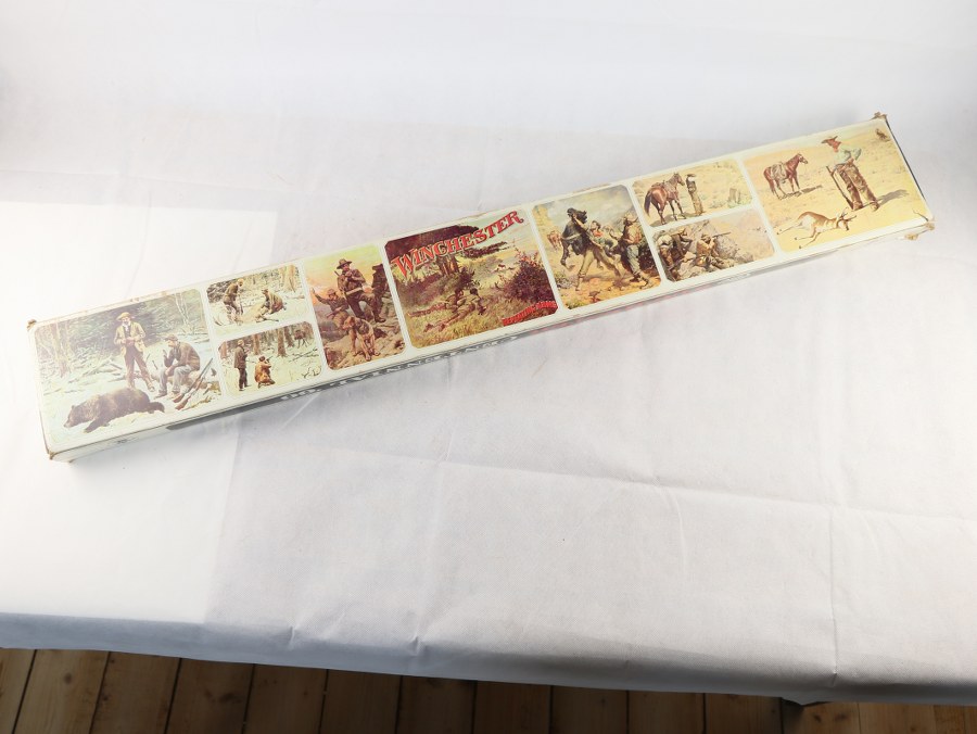 Winchester Centennial '66 Saddle Ring carbine. Calibre .30-30, numéro de série 27171, canon octogonal brillant, longueur 64 cm. CIP 1966. Revue complète. Inscrit "A Century of Leadership 1866 - 1966" à droite de la racine du canon. Finition haute brillance complète. Boîtier de serrure et capuchon de crosse plaqués or. Crosse en noyer clair. Dans la boîte d'origine. Presque nouveau. Longueur environ 99 cm. Kaliber .30-30, Seriennummer 27171, Blanker Oktagonallauf, Länge 64 cm. CIP 1966. Vollmagazin. Rechts an der Laufwurzel bezeichnet "A Century of Leadership 1866 - 1966". Vollständige Hochglanzbrünierung. Schlosskasten und Kolbenkappe vergoldet. Heller Nussholzschaft. Im Originalkarton. Fast neuwertig. Länge circa 99 cm. Plus de photos sur AIOLFI.COM, more photos on AIOLFI.COM.