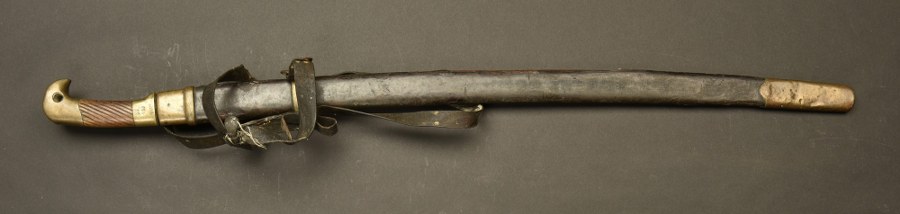 Sabre de cosaque modele 1881, appelé Shashka. Poignée en bois striée avec calotte en laiton. Nombreux marquages. Lame courbe a pan creux, datée 1901. Fourreau en bois gaine de cuir avec chape et bouterolle laiton. Fixée sur le pontet de chape et sur la boucle de suspension du fourreau, une sangle de portage en cuir fin formant un nœud en fleur a 3 pétales. usure importante et patine de l ensemble. Russian Cossack shashka sword pattern 1881. Wooden grip. Lots of markings. Curved blade dated 1901. Leather covered wooden scabbard, in poor condition. Still attached, a leather suspension strap with a flower shape knot. Patina and traces of use. Plus de photos sur WWW.AIOLFI.COM, more photos on WWW.AIOLFI.COM.