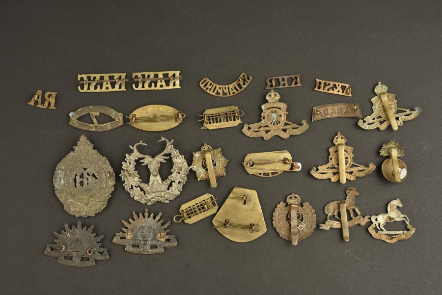 Cap badges et titres d'épaules anglais, écossais, canadien, australiens, certains avec attaches cassées ou manquantes. 3 des titres sont pour des bataillons territoriaux. Plus de photos sur WWW.AIOLFI.COM, more photos on WWW.AIOLFI.COM.