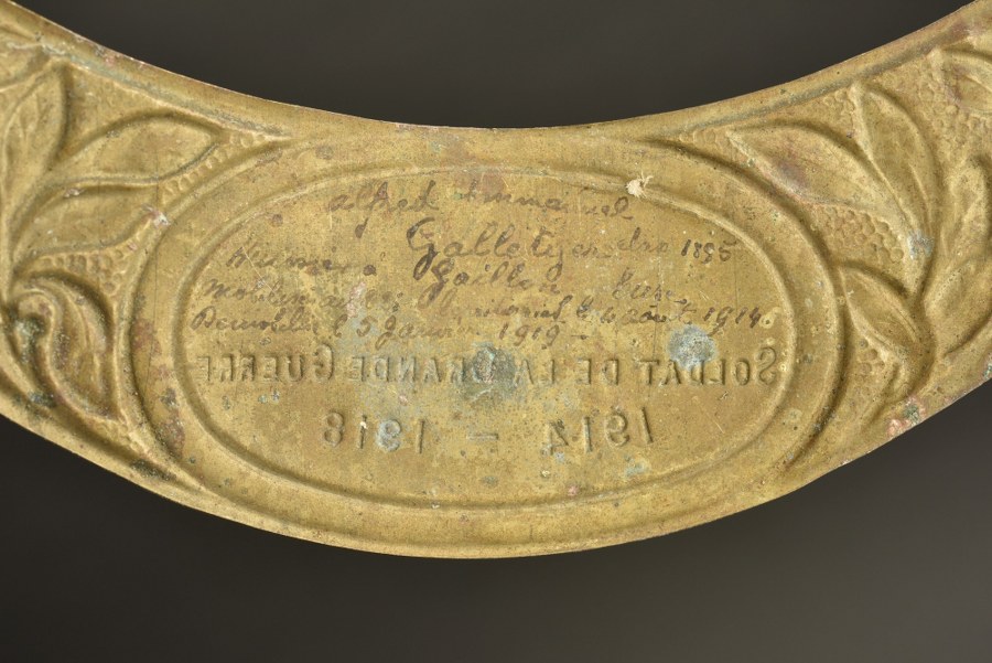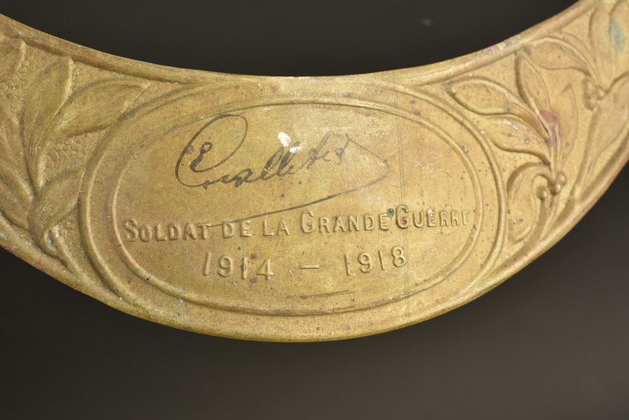 Ensemble de cuivreries francaises Bandeau laiton pour casque à crinière avec attribut à la grenade. 3 plaques laitons soldat de la Grande Guerre dont une avec un nom manuscrit. Attribut de giberne d'artillerie. Plus de photos sur WWW.AIOLFI.COM, more photos on WWW.AIOLFI.COM.