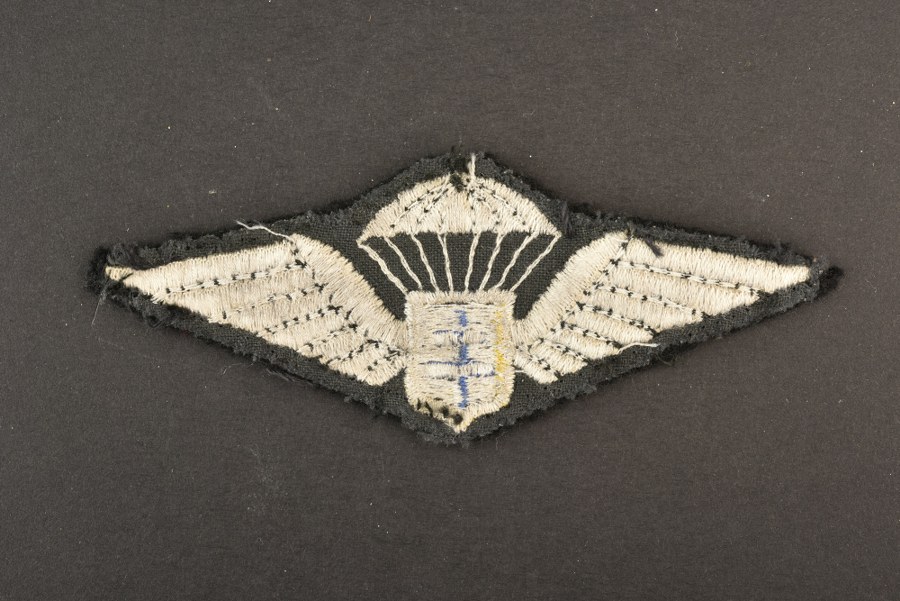 Brevet de parachutiste France Libre. Modèle brodé sur fond noir. Visiblement décousu d'une vareuse. A noter une certaine usure et patine de la pièce. Etat II+. Plus de photos sur WWW.AIOLFI.COM, more photos on WWW.AIOLFI.COM.