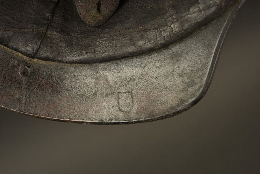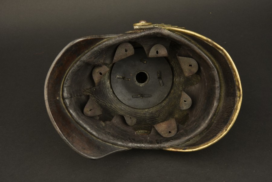 Casque à pointe Badois modèle 1867. Casque à pointe troupe modèle 1867. Bombe basse, pointe sur embase ronde avec Perlring. Plaque badoise à fixation par vis du modèle 1871. Jugulaire à écailles plates. Bonne cocarde badoise laiton à petit trou. Coiffe à dents de loups, cuir légèrement durci. Marquages sur la nuquière peu lisibles. Un petit trou sur la nuquière.