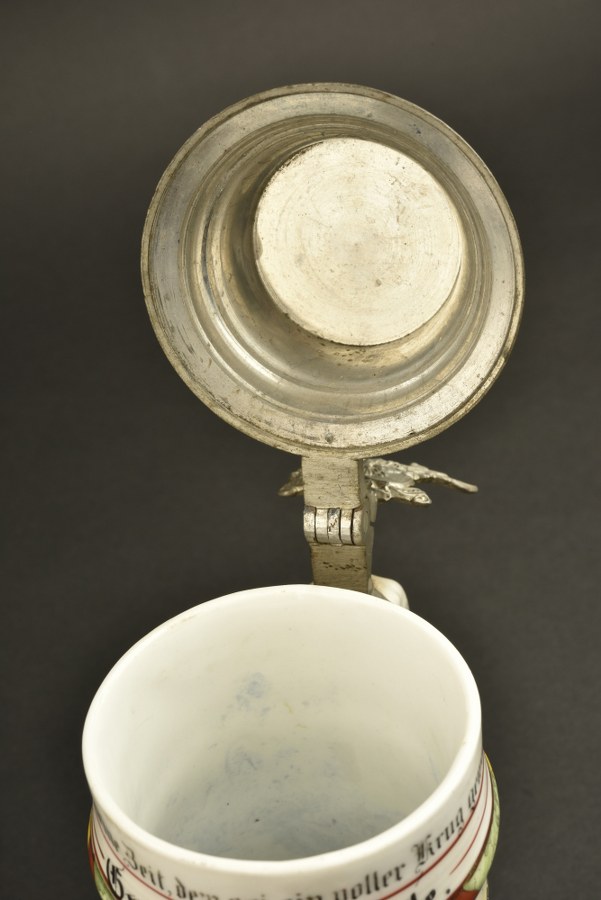 Chope de réserviste du 109e Leib Grenadier Regiment badois. Belle chope du LGR109 de Karlsruhe, en porcelaine, motifs rehaussés à la main. Au nom du Grenadier Oechsle repris dans la Namenliste. Beau couvercle avec couronne ducale sur un coussin. Pièce de pouce au griffon badois. Lithophanie, mais le fond a été cassé et réparé, un trou subsiste. Hauteur 26 cm. usure et patine. Plus de photos sur WWW.AIOLFI.COM, more photos on WWW.AIOLFI.COM.