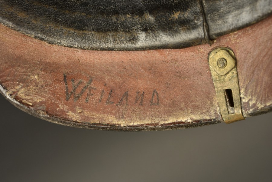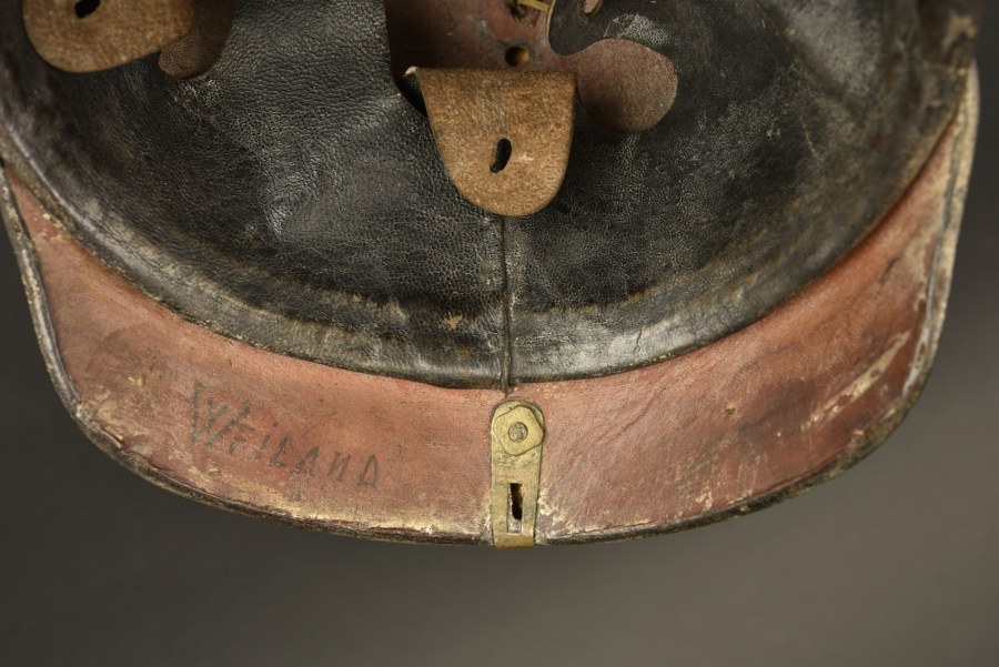 Casque à pointe modèle 1895 du 111e régiment Badois. Casque à pointe troupe modèle 1895 marqué à la peinture blanche dans la bombe JR111 1900 I.B, bombe non repercée, avec traces de vernis postérieur. Plaque au griffon, pontets soudés d'origine. Pointe fixe mais tourne sur elle-même sur l'embase. Bonne Reichscocarde, Landcocarde reproduction. Bonne jugulaire en état moyen, fragile. Coiffe à dents de loup en cuir noir. Nom WEILAND sur la nuquière. Usure et patine. Plus de photos sur WWW.AIOLFI.COM, more photos on WWW.AIOLFI.COM.