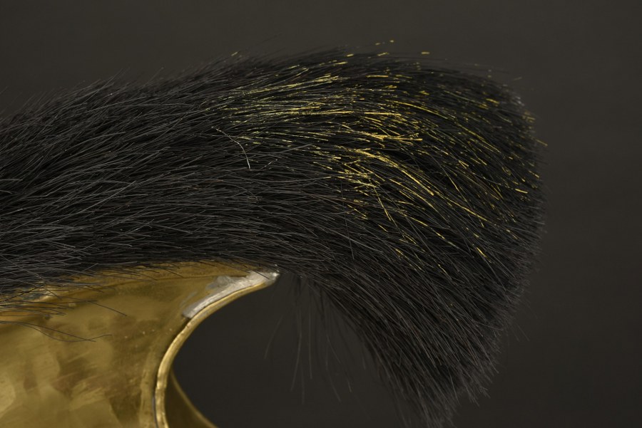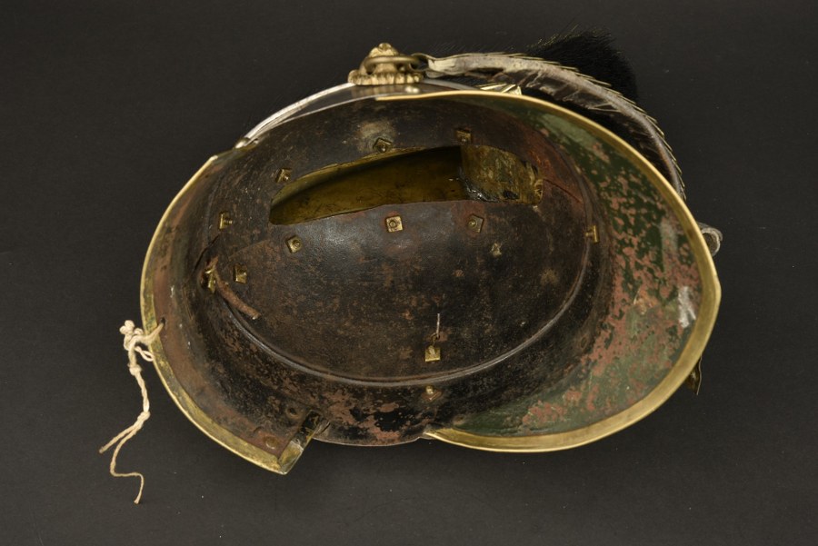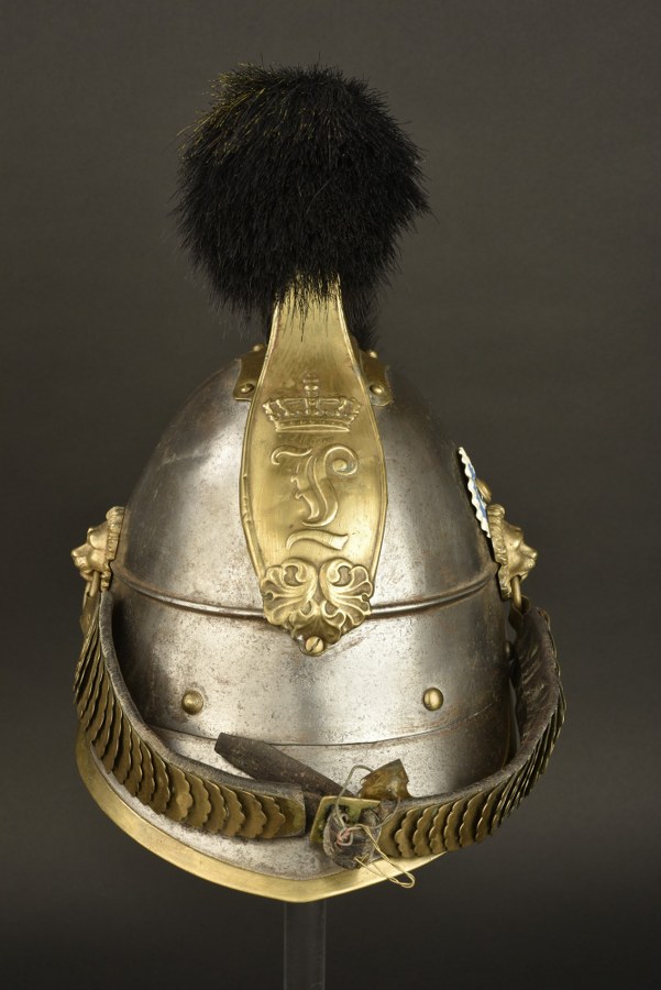 Casque de cuirassier bavarois 1842. Beau casque de cuirassier bavarois, modèle 1842 porté ainsi jusque 1848 sous le règne du Roi Louis de Bavière. Bombe en acier poli à garnitures laiton. Grand cimier lisse avec plaque attenante avec le chiffre de Louis 1er couronné. Crinière de crin noir. Jugulaires à écailles à 5 festons fixées sur anneaux dans la gueule de lions, dont celle côté gauche surmontée de la cocarde bavaroise, possiblement repeinte. Dessous de visière peint en vert. Manque l'étage terminal de la nuquière. Coiffe absente comme souvent. Plus de photos sur WWW.AIOLFI.COM, more photos on WWW.AIOLFI.COM.