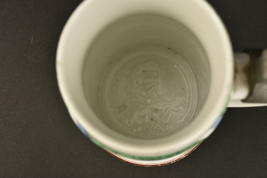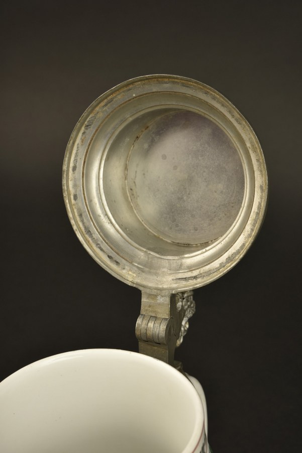 Chope de réserviste du 15e Régiment Bavarois de Neuburg. Chope de réserviste en porcelaine au nom de Johann Schmid du Bay. 15IR de Neuburg en 1903-1905. Le nom est repris dans la Namensliste. Couvercle d'origine avec haut en forme de prisme et pièce de pouce au lion bavarois. Légère usure, un minuscule coup au bord de l'ouverture sinon très bel état. Lithophanie en fond de chope. Plus de photos sur WWW.AIOLFI.COM, more photos on WWW.AIOLFI.COM.