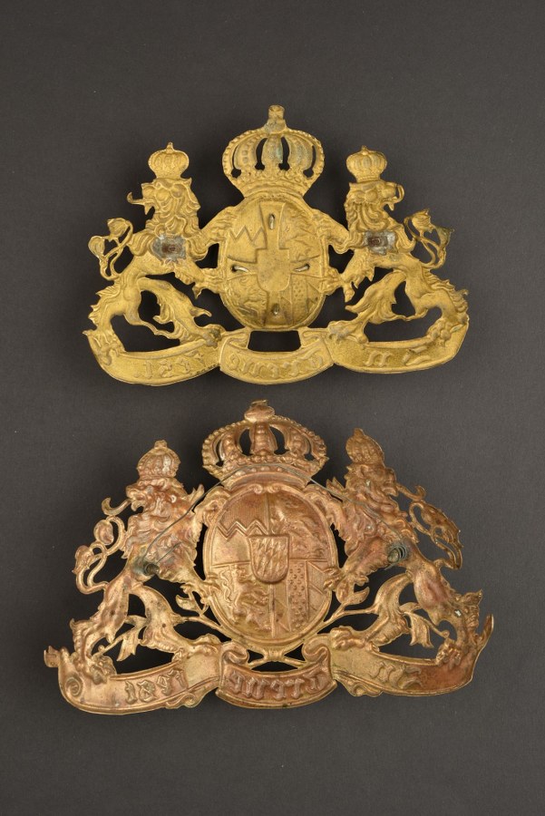 2 plaques de casque à pointe bavarois. Une plaque modèle 1886 grand modèle en laiton avec feuillages, tiges filetées de fixation soudées d'origine. Une très jolie plaque de réserve, taille intermédiaire, laiton avec croix de réserve maillechort, tiges filetées soudées d'origine. Plus de photos sur WWW.AIOLFI.COM, more photos on WWW.AIOLFI.COM.