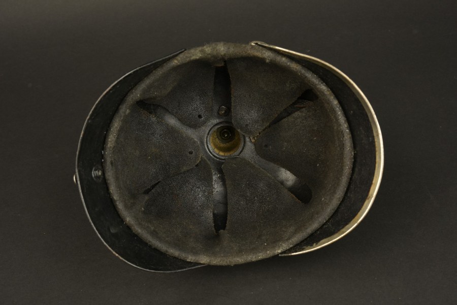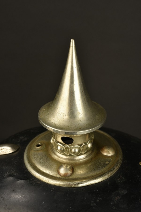 Casque à pointe bavarois en tôle garnitures maillechort. Bonne coque en tôle, repeinte en noir. Initialement pour plaque à large pontet central, repercée pour y adapter une plaque bavaroise troupe en maillechort. Toutes garnitures en maillechort, dont pointe dévissable sur embase à Perlring, faisant de cette configuration un casque de sous officier du Infanterie Leib Regiment. La coiffe en cuir est une reproduction. Une bonne cocarde Reich, jugulaire à garnitures maillechort, sans garantie. Landcocarde absente. Plus de photos sur WWW.AIOLFI.COM, more photos on WWW.AIOLFI.COM.