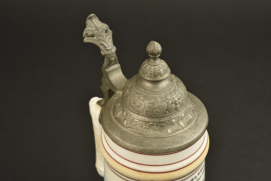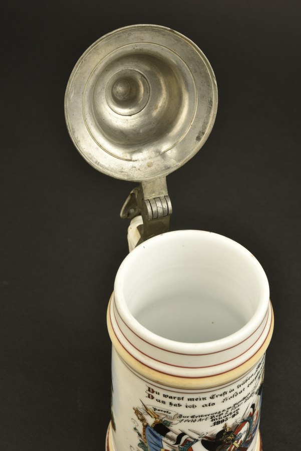 Chope de réserviste du Bayersiches FAR 1 de München. Chope de réserviste en porcelaine au nom de Dörflinger de la 2 Fahrende Batterie du Bay. Feld Artillerie Regiment Nr 1 de Munich en 1893-1895. Couvercle simple. Lithophanie. Hauteur 23 cm. Plus de photos sur WWW.AIOLFI.COM, more photos on WWW.AIOLFI.COM. Usure et patine