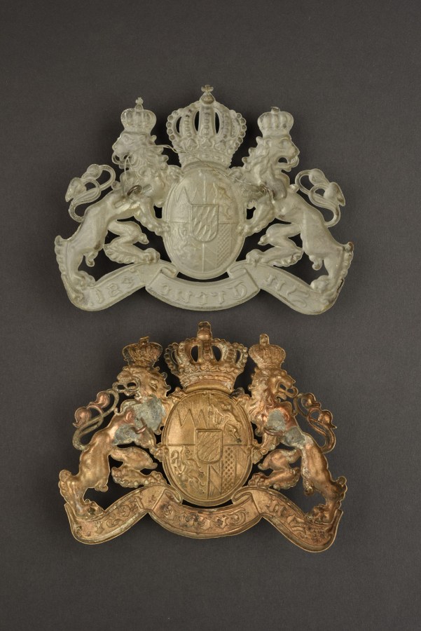 2 plaques de casque à pointe bavarois troupe. Une plaque modèle 1896 laiton avec ses pontets soudés d'origine. Une plaque modèle 1915 en fer peint avec ses pontets soudés d'origine. Plus de photos sur WWW.AIOLFI.COM, more photos on WWW.AIOLFI.COM.