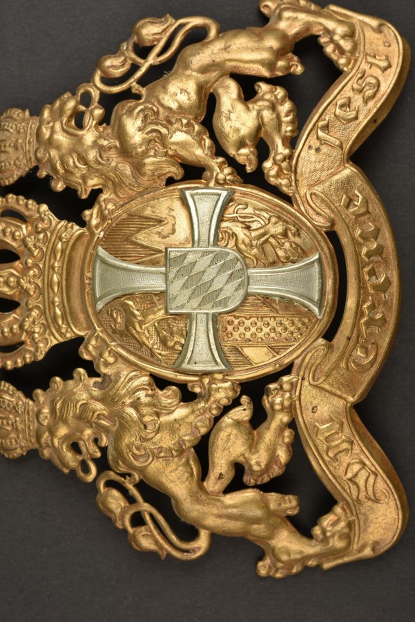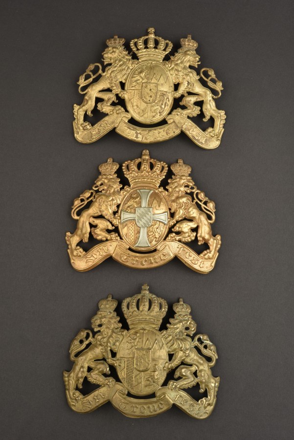 Ensemble de 3 plaques de casque à pointe bavarois. 3 plaques en laiton, troupe, modèle 1896. Une d'active en bon état avec pontets soudés d'origine. Une d'active pontets soudés d'origine avec renforts et réparations à l'arrière. Une de réserve en très bel état avec pontets soudés d'origine. Plus de photos sur WWW.AIOLFI.COM, more photos on WWW.AIOLFI.COM.