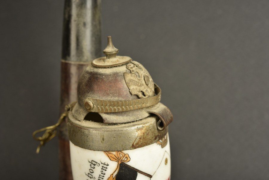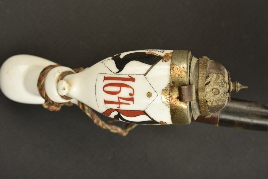 Pipe de réserviste du JR164 de Hanovre. Pipe en porcelaine à motif de la patte d'épaule du régiment et couvercle en forme de casque à pointe. Bon état, légère usure et patine. Plus de photos sur WWW.AIOLFI.COM, more photos on WWW.AIOLFI.COM.