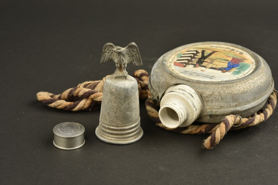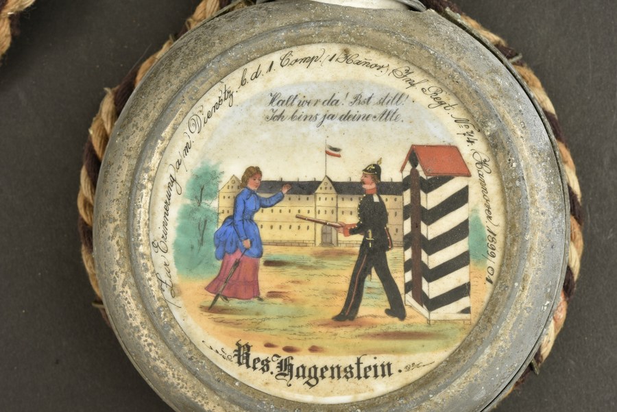 Gourde de réserviste du JR 74 de Hanovre. Gourde en porcelaine peinte, cerclée de métal blanc. Marqué au réserviste Hagenstein du 74e régiment d'infanterie de Hanovre. Bouchon surmonté d'un aigle, cordon au couleurs impériales, insolé. Usure et patine importantes. Plus de photos sur WWW.AIOLFI.COM, more photos on WWW.AIOLFI.COM.