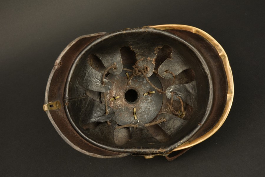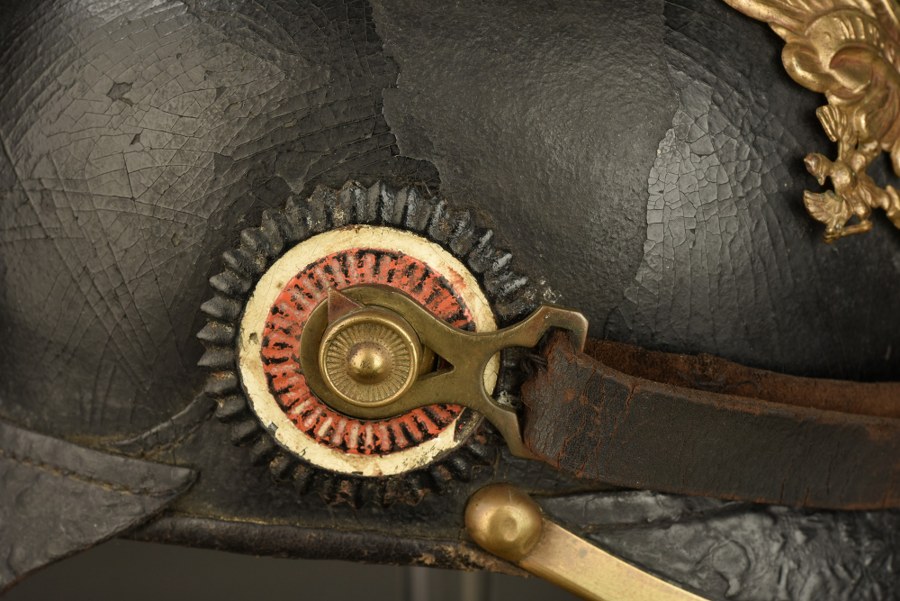 Casque à pointe troupe modèle 1895 plaque Waterloo Hanovre. Casque à pointe troupe M1895 à garnitures laiton. Plaque à l'aigle modèle 1895 à pontets, un a une soudure reprise anciennement, avec banderole Waterloo rapportée suivant la directive de 1899. Bombe non repercée, un manque de verni côté droit. Un petit trou sur la nuquière. Marquages difficilement lisibles. Coiffe présente avec usure. Bonnes cocardes, jugulaire authentique mais cassée et réparée en deux endroits. Plus de photos sur WWW.AIOLFI.COM, more photos on WWW.AIOLFI.COM.