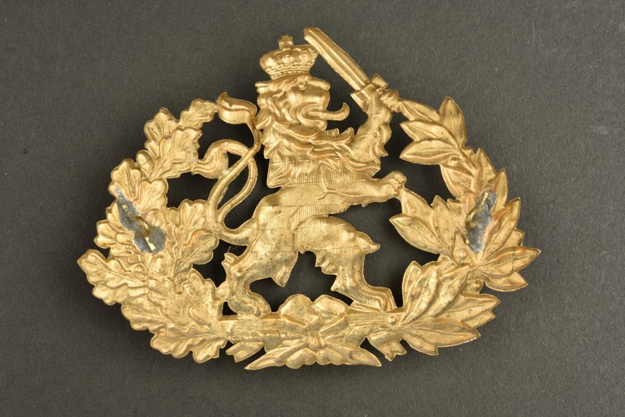 Plaque de casque hessois troupe modèle 1895. Très belle plaque laiton au lion hessois, modèle 1895. Belle dorures, pontets soudés d'origine. Plus de photos sur WWW.AIOLFI.COM, more photos on WWW.AIOLFI.COM.
