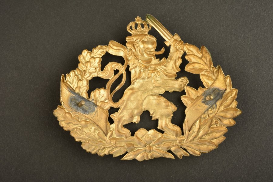 Hesse - Reproduction de plaque de casque d'officier du 117ème régiment. Très belle reproduction galvanoplastie d'une plaque de casque à pointe d'officier au lion hessois, avec banderoles aux dates 1697 et 1897 spécifique au 117ème régiment d'infanterie. Fixation par vis fendues soudées. Plus de photos sur WWW.AIOLFI.COM, more photos on WWW.AIOLFI.COM.