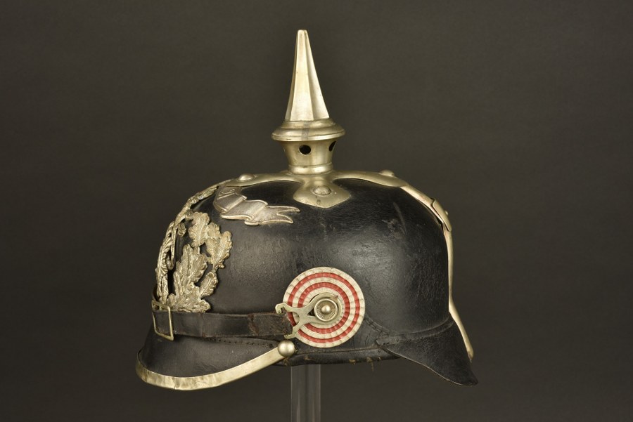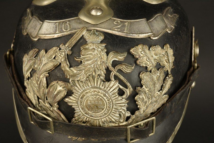 Casque à pointe du 115e régiment hessois. Casque à pointe modèle 1895 du 115e Leib Garde Regiment hessois. Belle bombe non repercée, bien marquée du fabricant Martin Mayer à Mainz et datée 1915, un coup côté droit. Toutes garnitures maillechort. Pointe cannelée spécifique au régiment, dévissable, sur embase trèfle. Plaque au lion avec étoile Gott Ehre Vaterland, à noter une cassure au niveau du départ des feuilles de chêne la rendant fragile. Plaque typique des fabrications de guerre, avec reste d'argenture. Surmontée de la banderole 1621. Bonnes cocardes, bonne jugulaire à garnitures maillechort mais recollée derrière une des boucle et présentant quelques fragilités. Jonc de visière maillechort, fendu en un endroit. Coiffe en cuir noir. Nuquière bien marquée RBA18...le modèle 1915 du LGR115. Plus de photos sur WWW.AIOLFI.COM, more photos on WWW.AIOLFI.COM.
