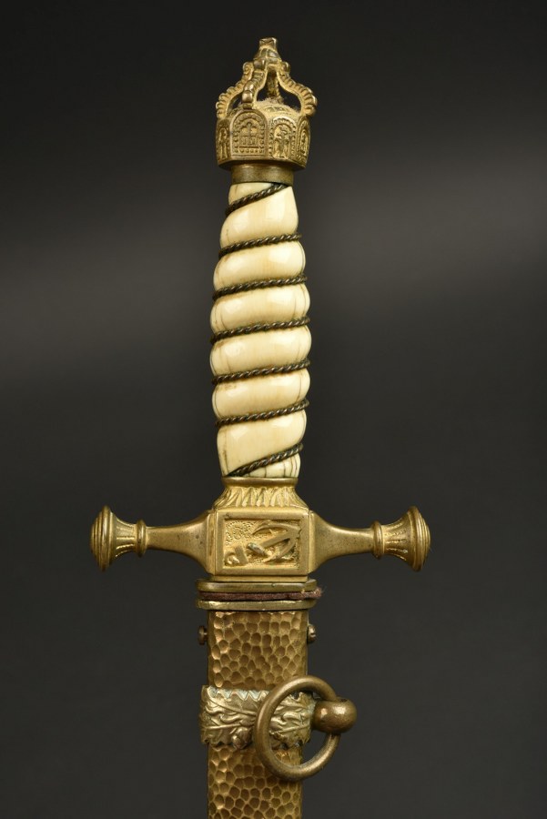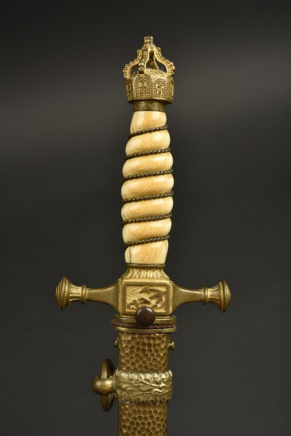 Dague de la Marine impériale allemande. Poignée blanche avec filigrane, pommeau en forme de couronne impériale, lame en faux damas . Fourreau à deux anneaux sur colliers de feuilles de chênes. Ensemble composite sans garantie. Plus de photos sur WWW.AIOLFI.COM, more photos on WWW.AIOLFI.COM.
