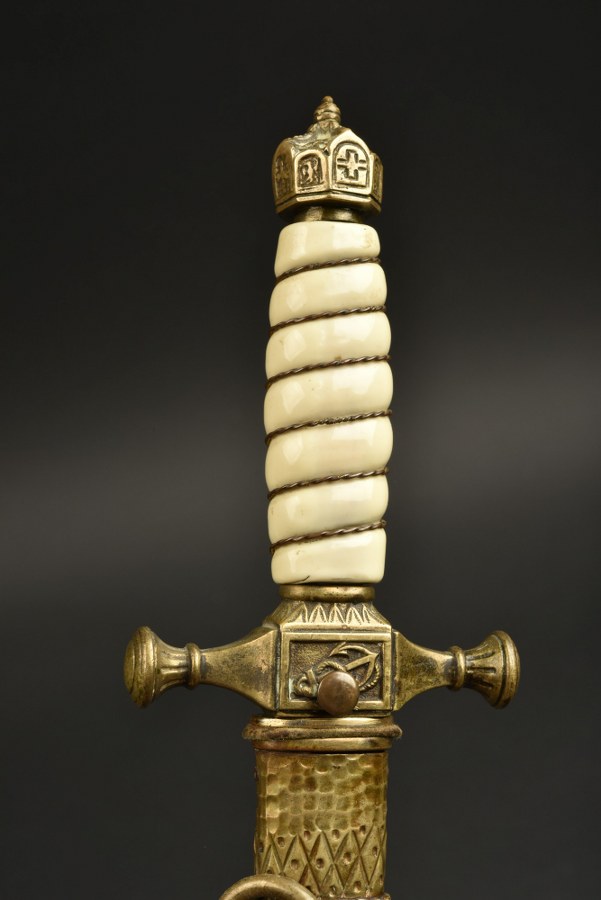 Dague de la Marine impériale allemande. Poignée blanche avec filigrane, pommeau en forme de couronne impériale, lame avec marquage E.P. & S Solingen, gravures à motifs d'ancre de marine, vaisseaux de guerre et motifs végétaux . Fourreau à deux anneaux sur colliers de feuilles de chênes. Une ancre de marine gravée. Ensemble composite sans garantie. Plus de photos sur WWW.AIOLFI.COM, more photos on WWW.AIOLFI.COM.