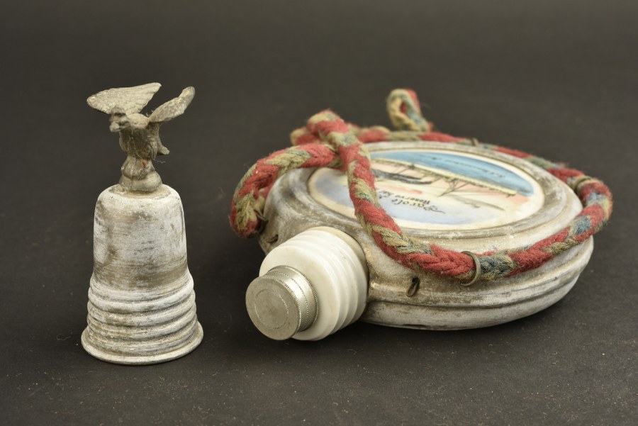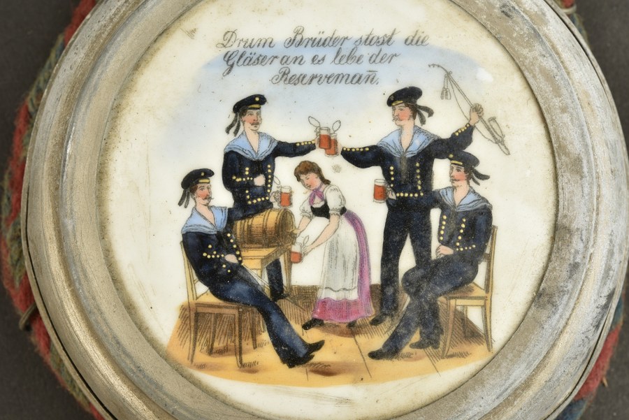 Gourde de réserviste de Marine Kanonenboot Panther. Gourde en porcelaine cerclée de métal blanc, peinte à la main, d'un réserviste du S.M. Kanonenboot Panther. Bouchon surmonté d'un aigle impérial. Cordon rouge et bleu. Usure et patine, à nettoyer. Plus de photos sur WWW.AIOLFI.COM, more photos on WWW.AIOLFI.COM.