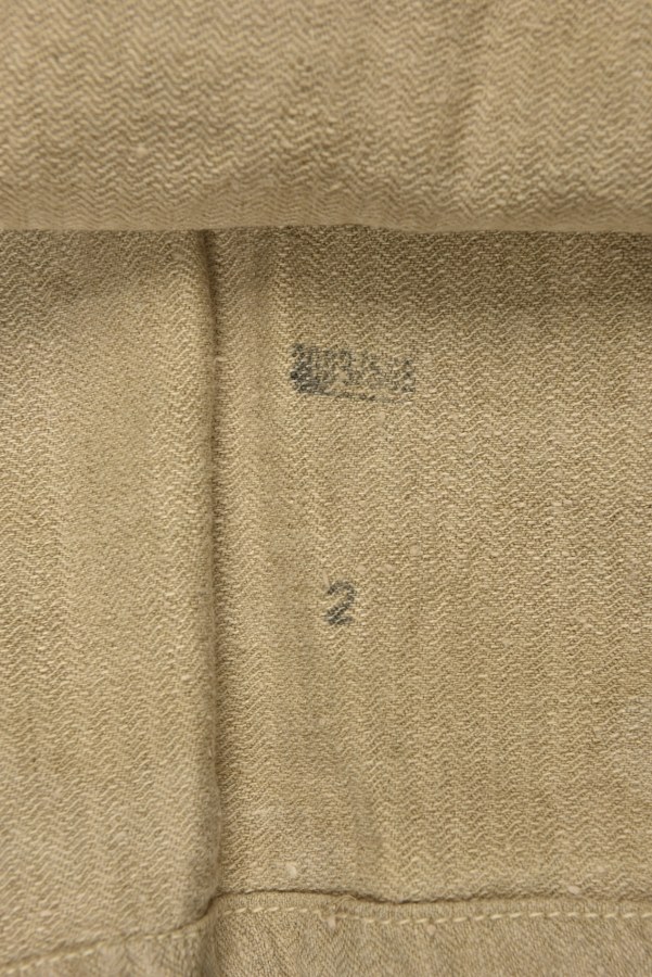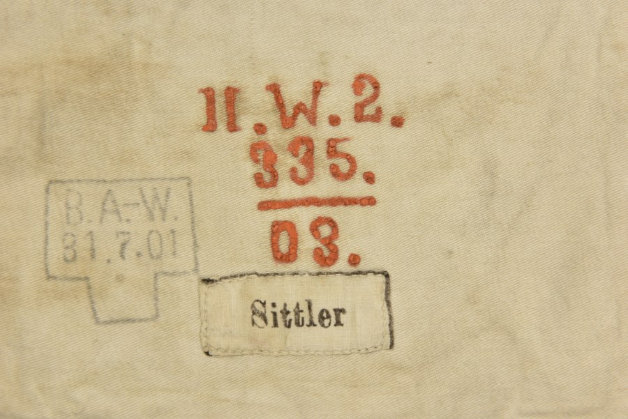 Ensemble de marin. Comprenant un col réceptionné BAW 31.7.01, ainsi qu'un marquage à la peinture orange II.W.2.33503 et une nominette Sittler. Un pantalon de pont en treillis blanc écru, un bouton est manquant, pas de marquage apparent. Une marinière en treillis blanc écru, boutons de manches absents. Tampon présent mais illisible excepté Taille 2. On y joint un sac à paquetage de marin allemand au nom de Laube, matricule II.T.7.341/K, mauvais état, fond troué. Etat II+. Plus de photos sur WWW.AIOLFI.COM, more photos on WWW.AIOLFI.COM.