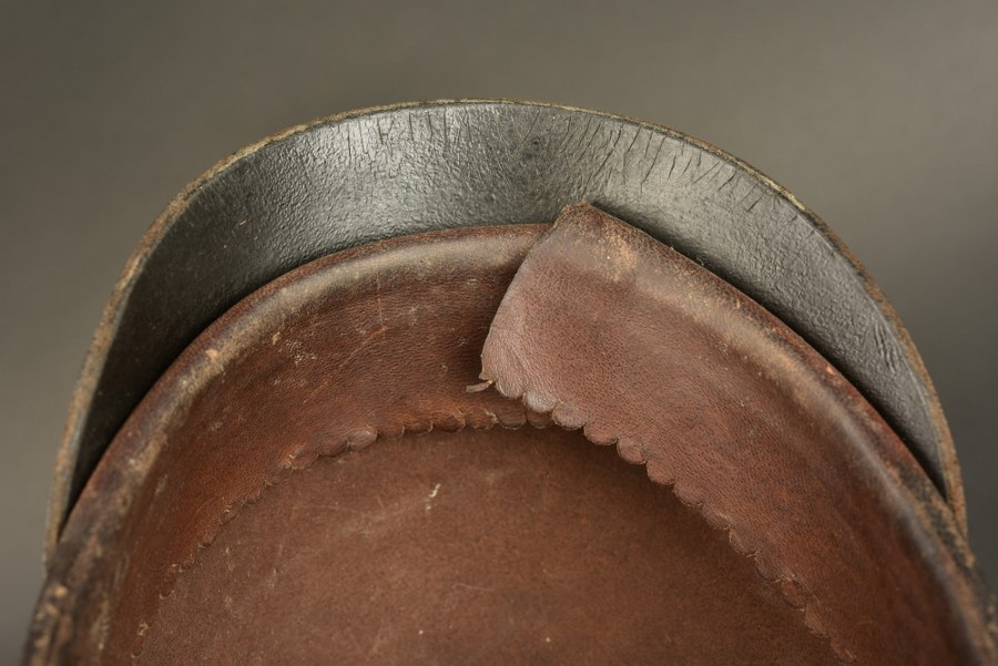 Tschako sous officier ou officier de JB14. Tschako en cuir type officier avec bandeau de sudation en cuir. Soie absente. Plaque du Mecklenburg Schwerin avec soleil rayonnant laiton et centre armorié en maillechort, fixé par tiges filetées et écrous carrés. Jugulaires à écailles plates fixées par rosaces pleines à pattes pliables. Un tampon à l'encre illisible en fond de bombe. Une Reichskokarde à petit trou type troupe. Usure et patine. Plus de photos sur WWW.AIOLFI.COM, more photos on WWW.AIOLFI.COM.